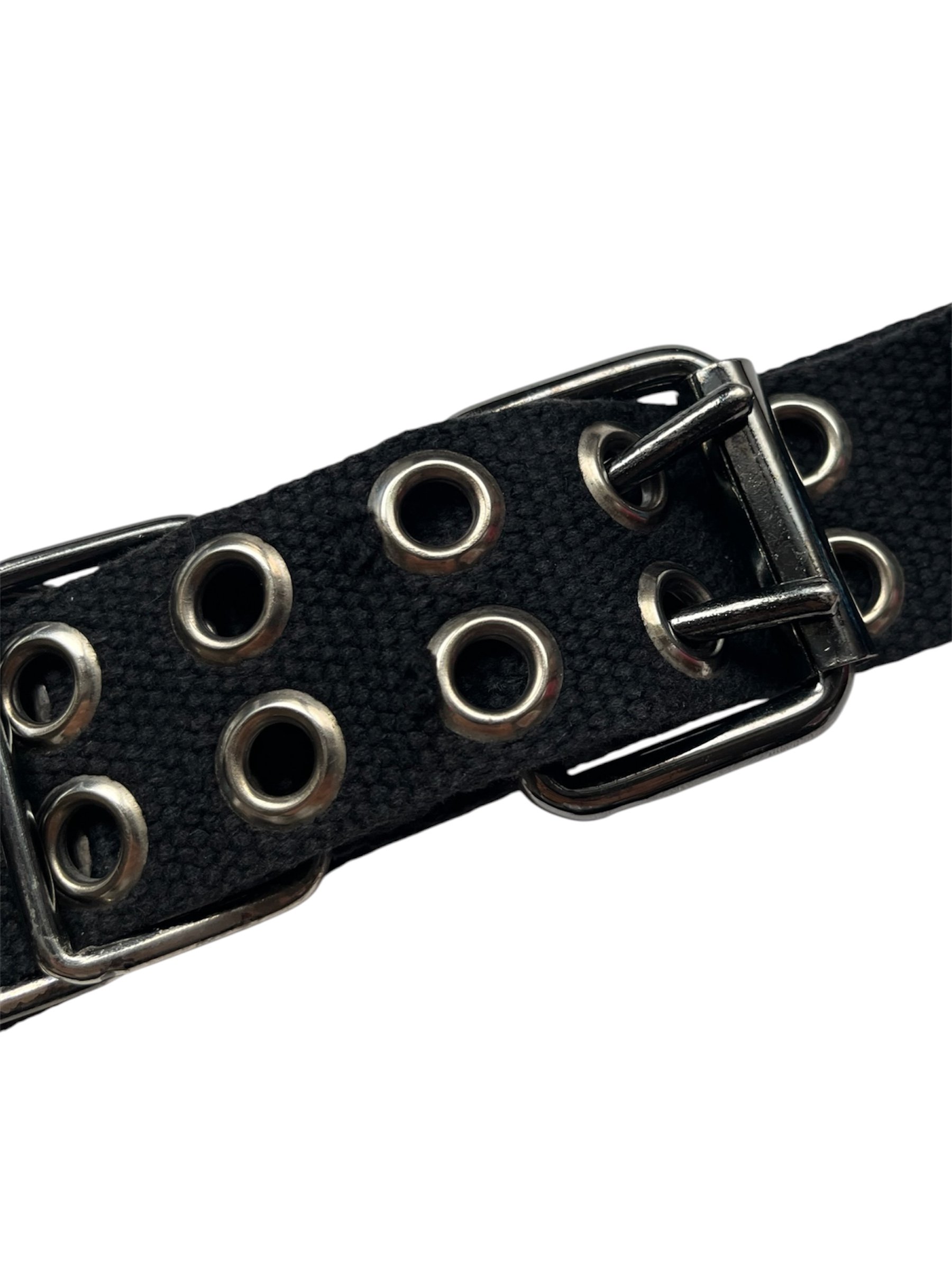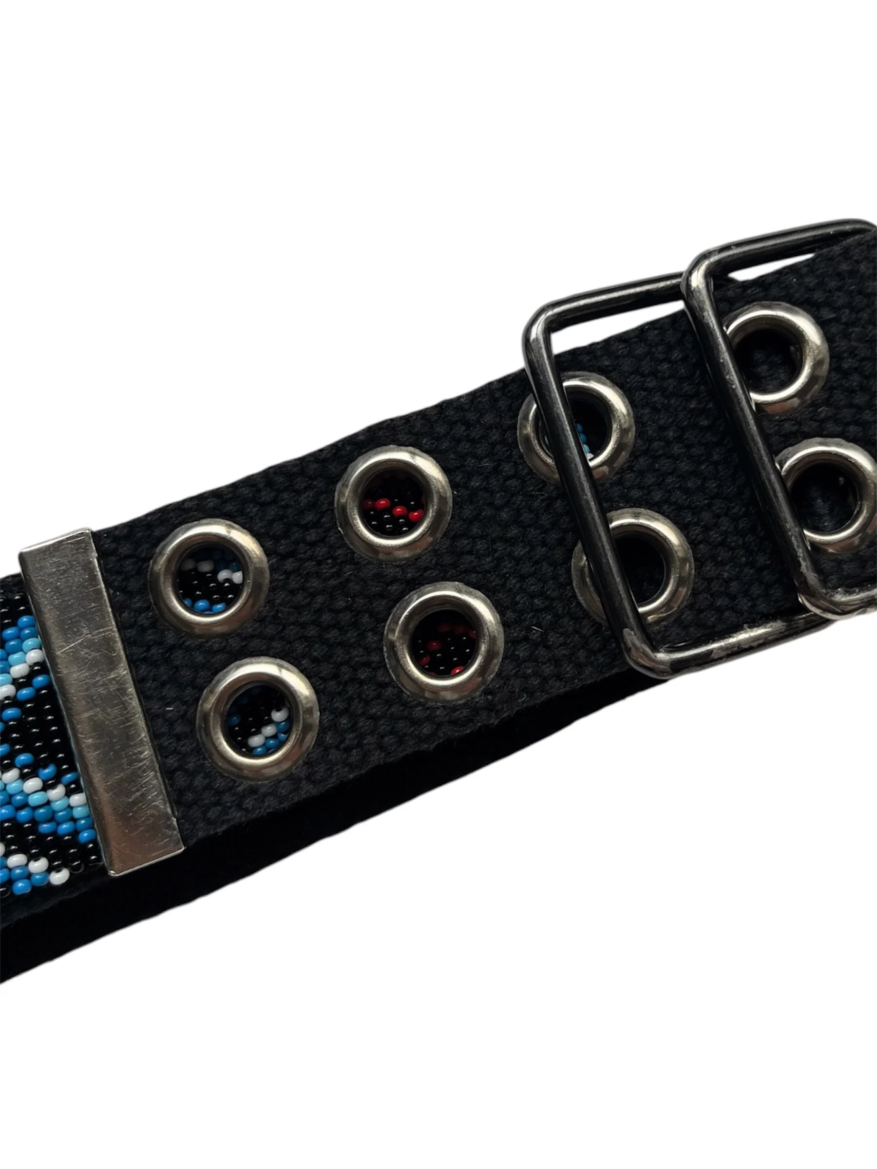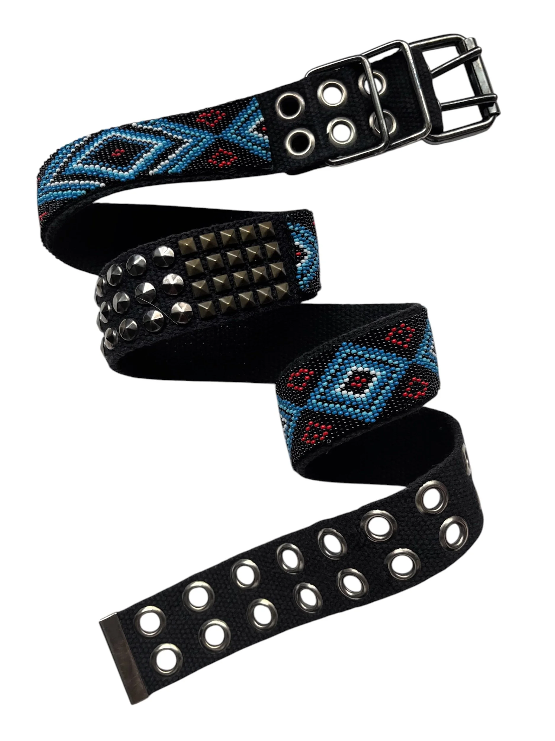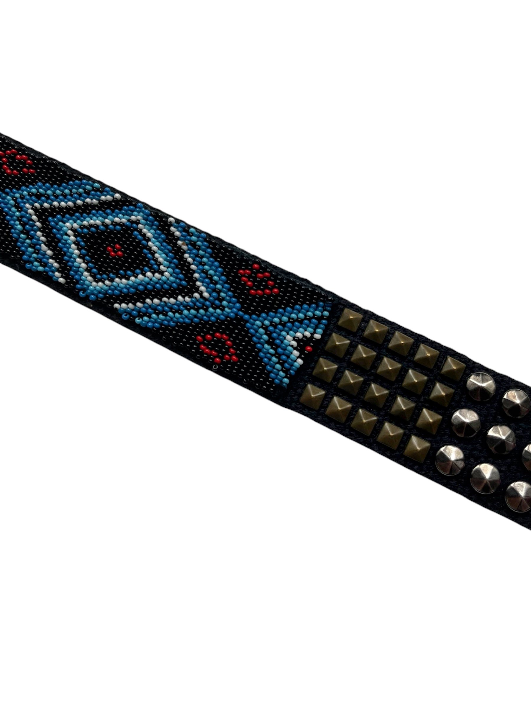 Iconic belt worn by Park Bom from 2NE1. Featuring tribal inspired details and metal studs on canvas.