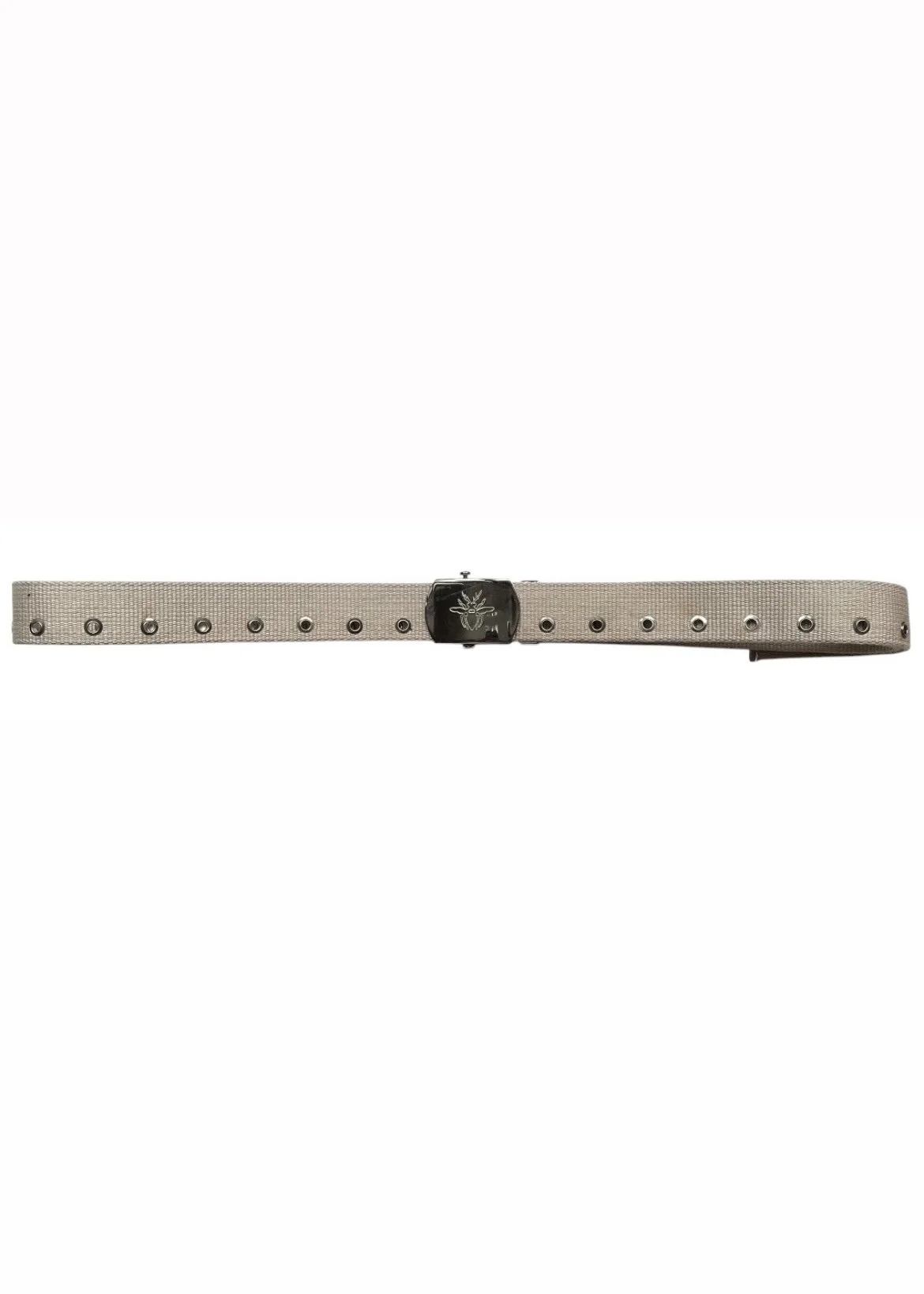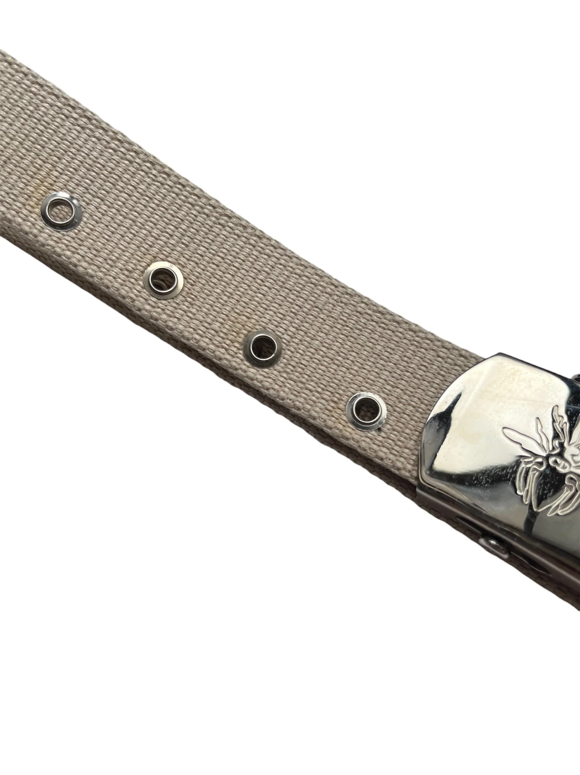 Beige canvas belt with metallic eyelets and a bee-engraved buckle with leather details.