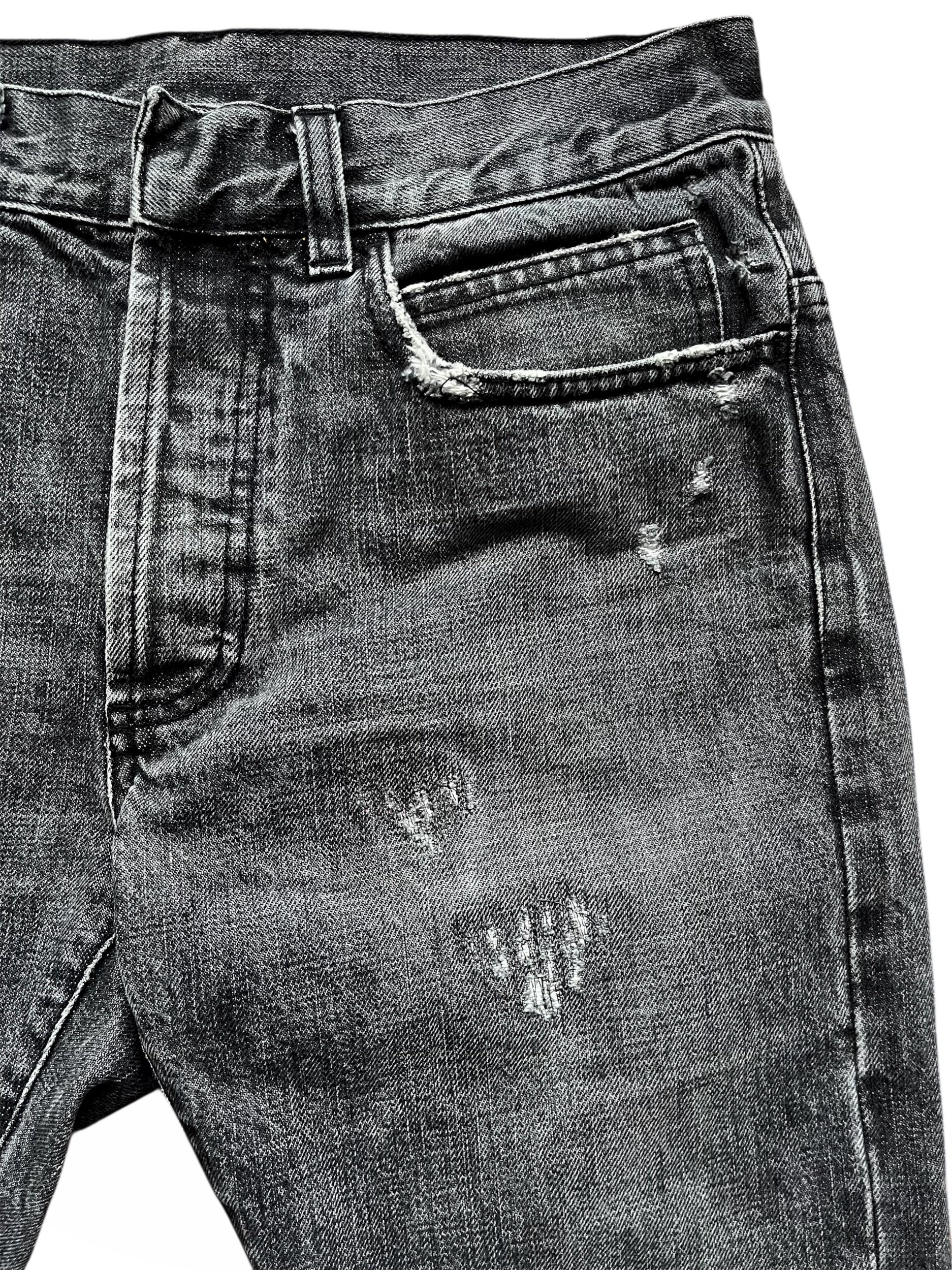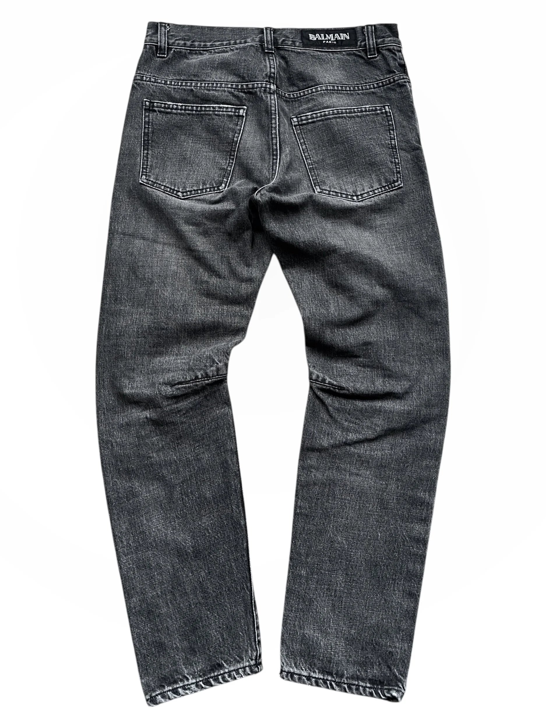 From Decarnin’s last collection at Balmain, these premium selvedge jeans feature hand distressed details and signature darts on the knees. They’re designed to be worn with boots.