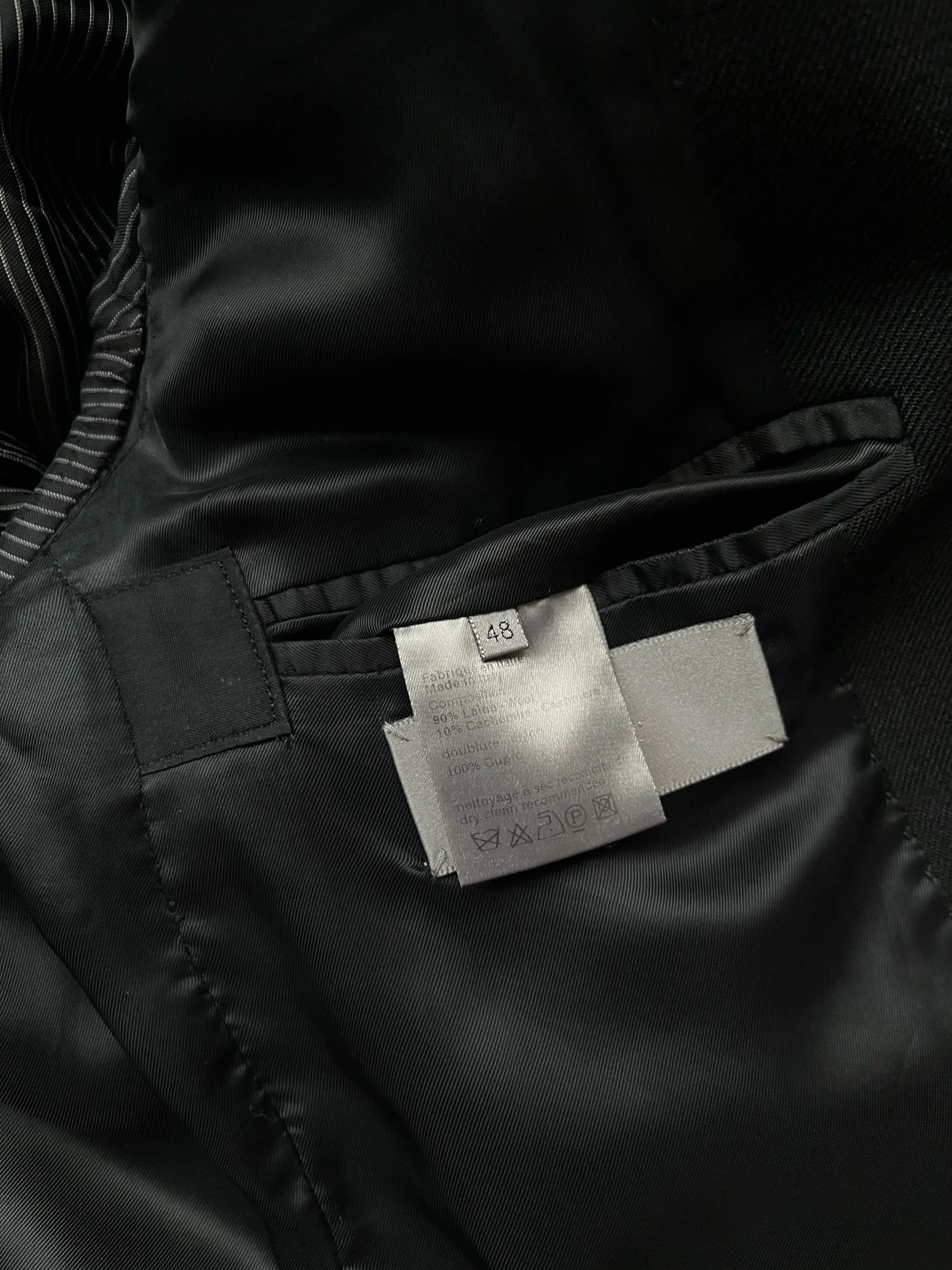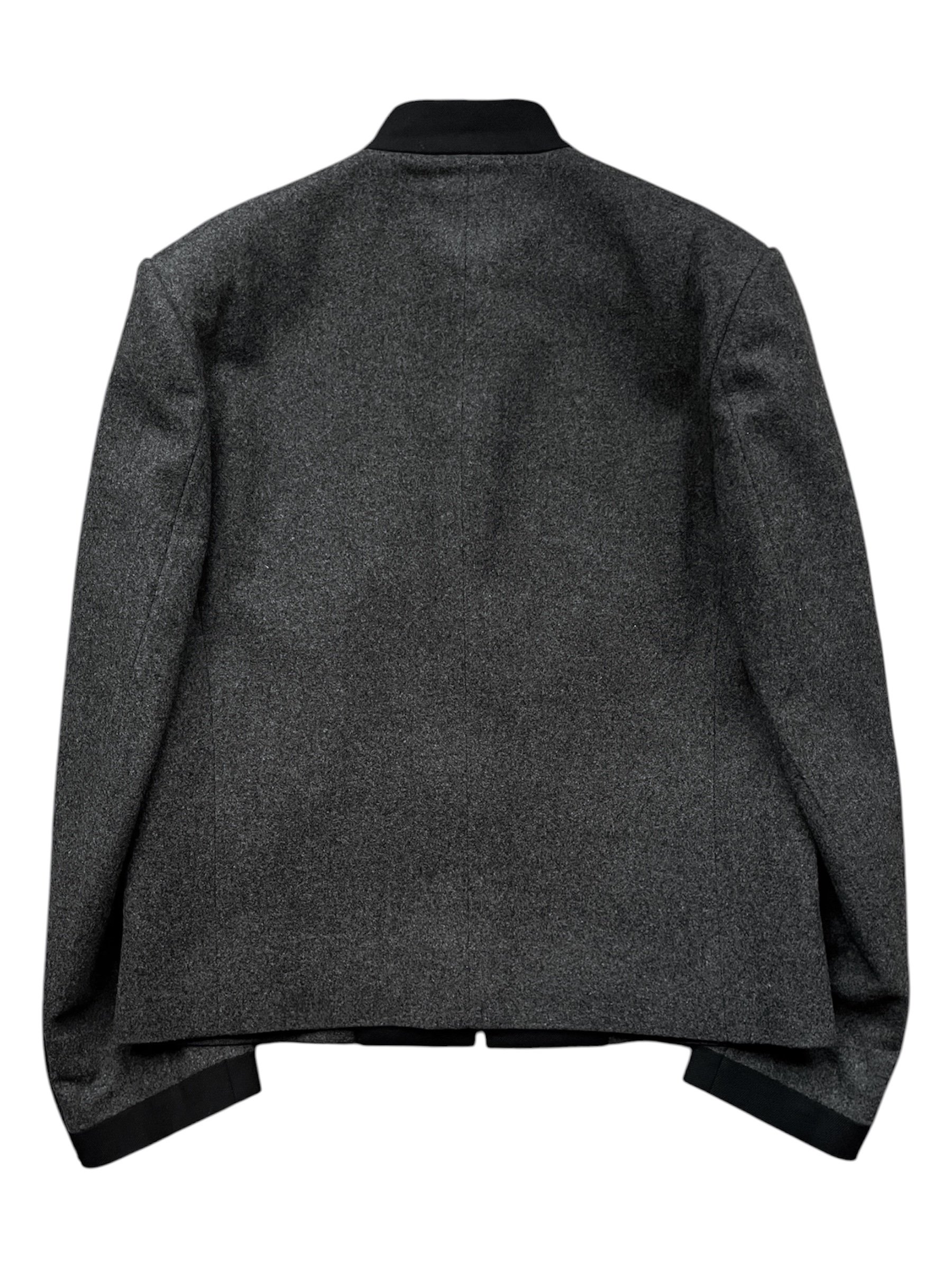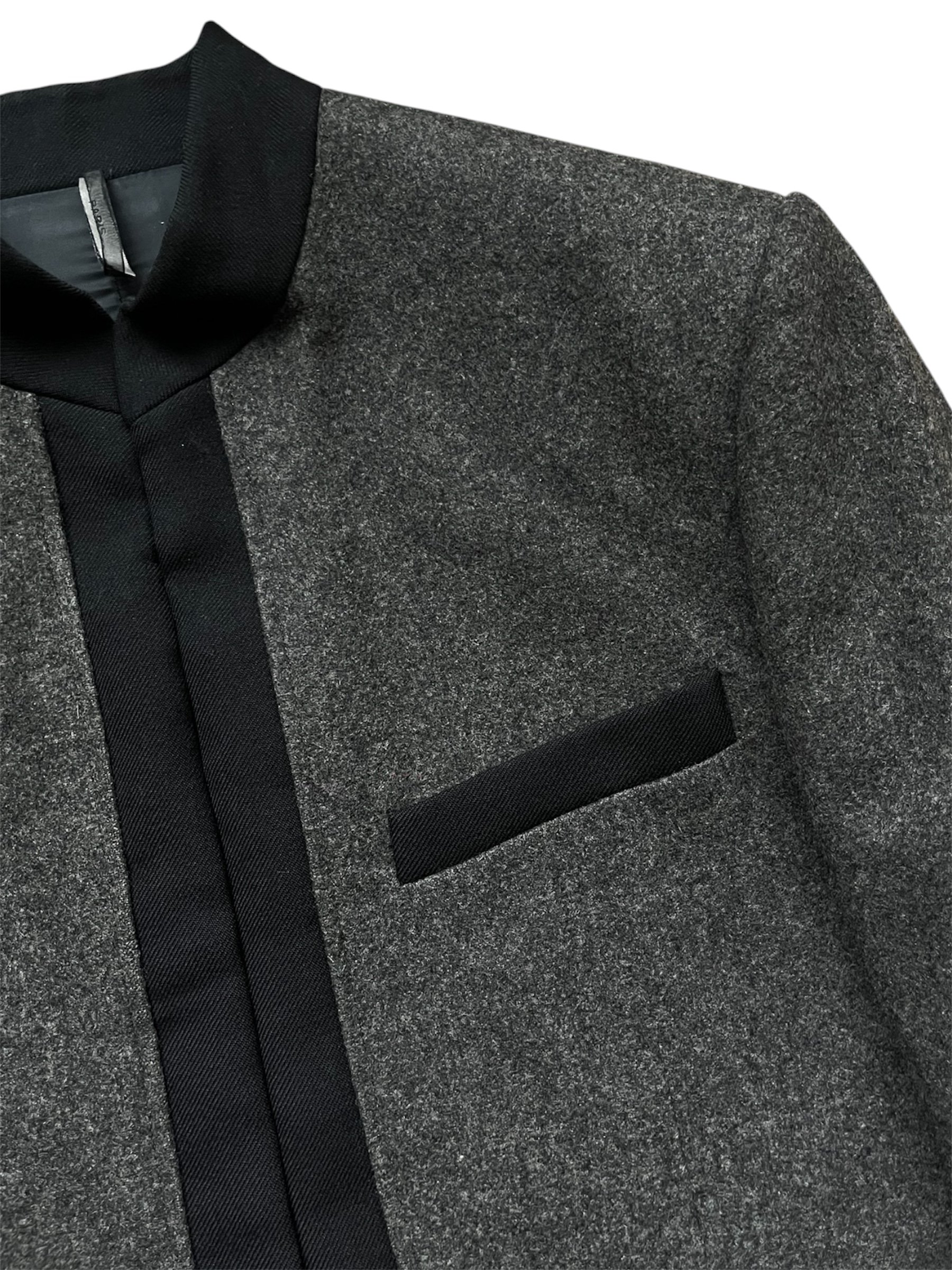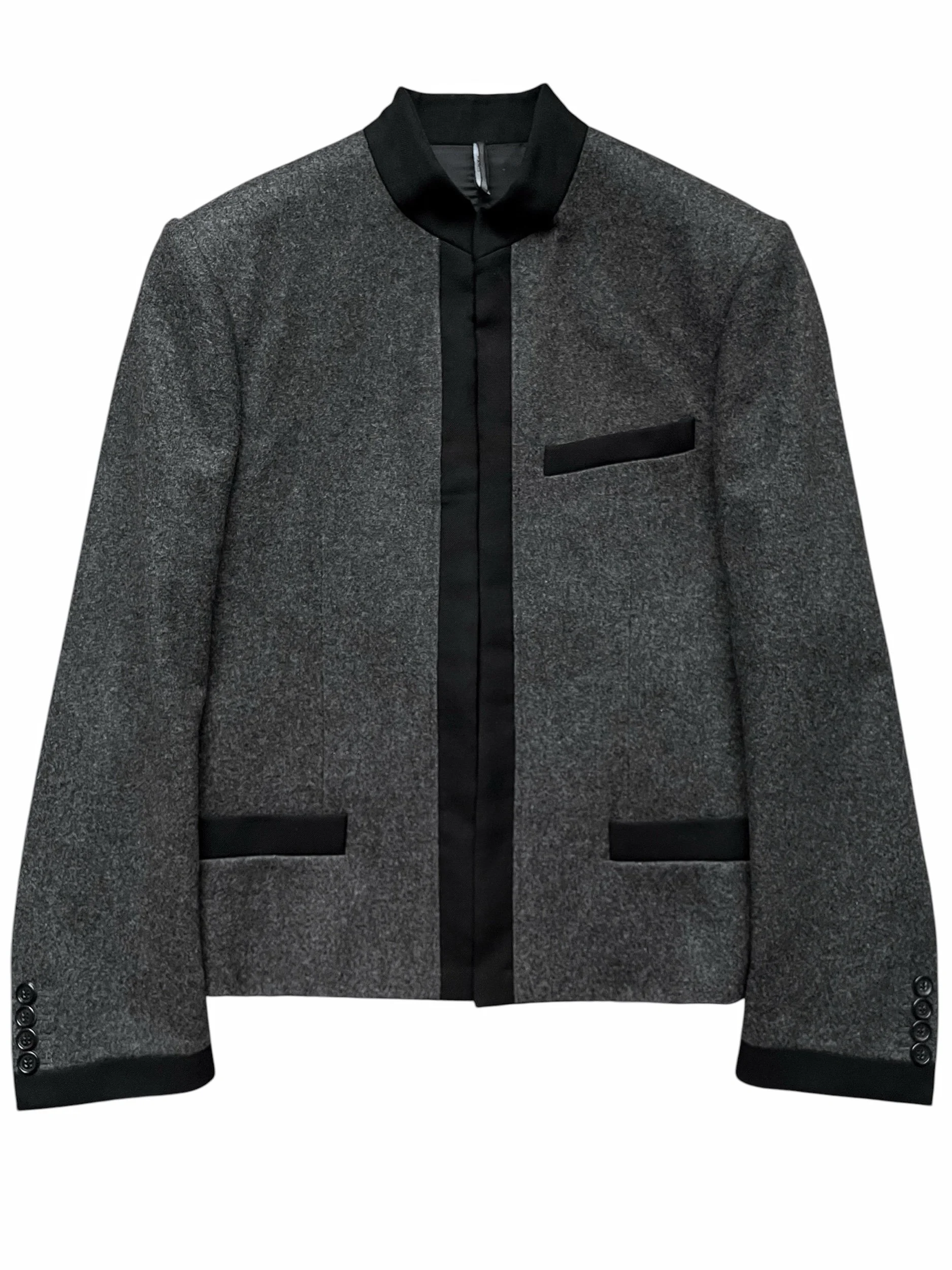 Black and grey officer jacket, worn on the runway show with cummerbunds jeans. Wool and cashmere.