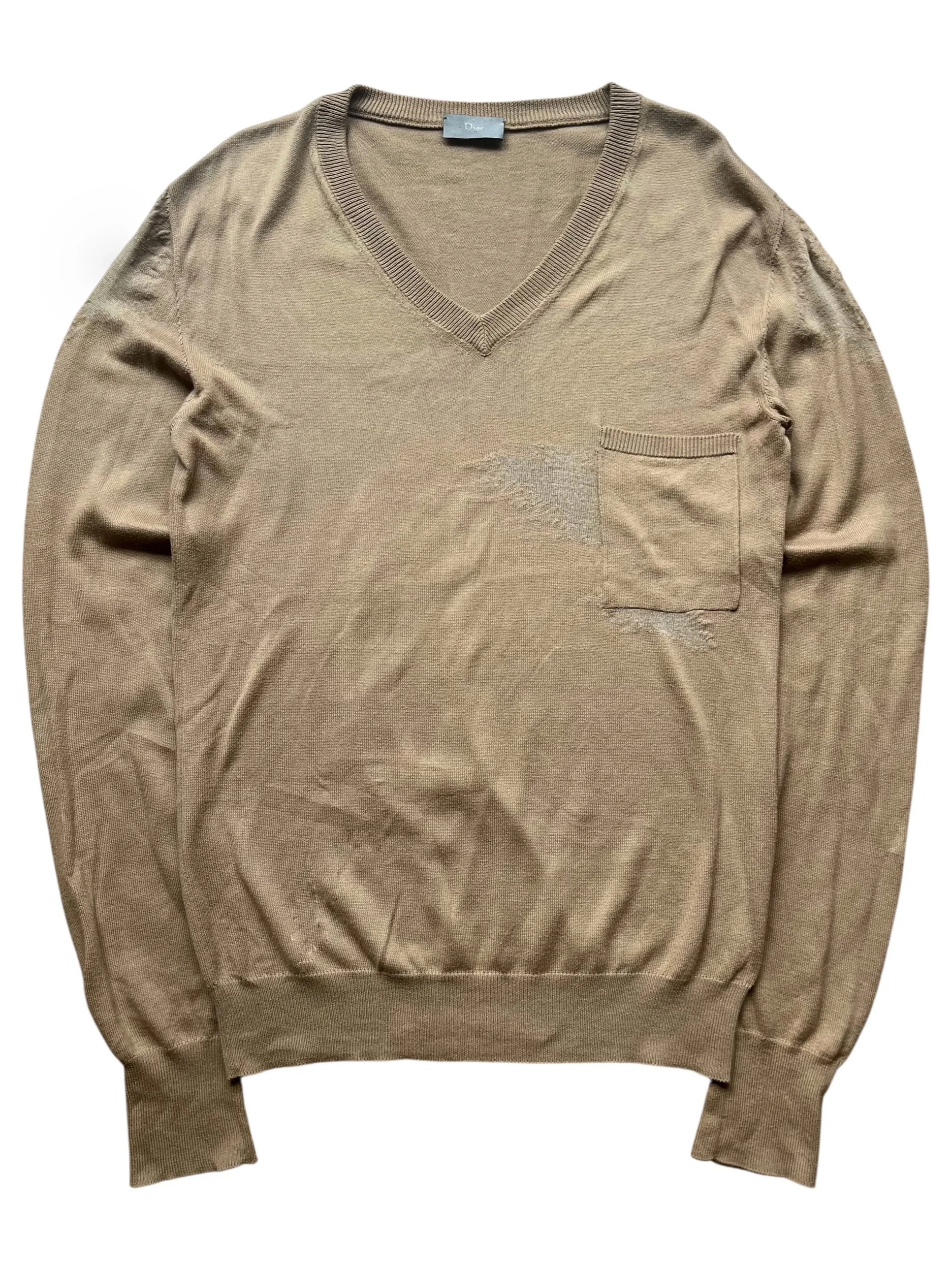 Featured on the runway in dark grey and rarely seen on the market, this cotton sweater is heavily distressed around the chest pocket, shoulders and elbows, as well as a deep V-collar. This sweater is meant to be oversized.