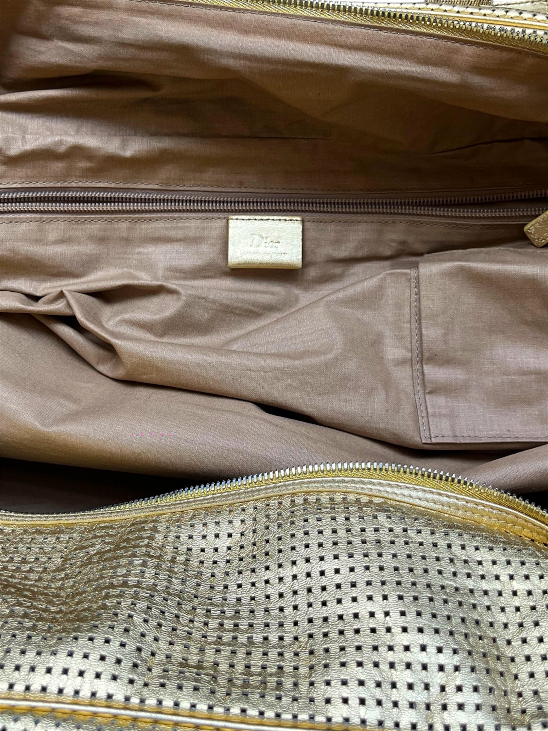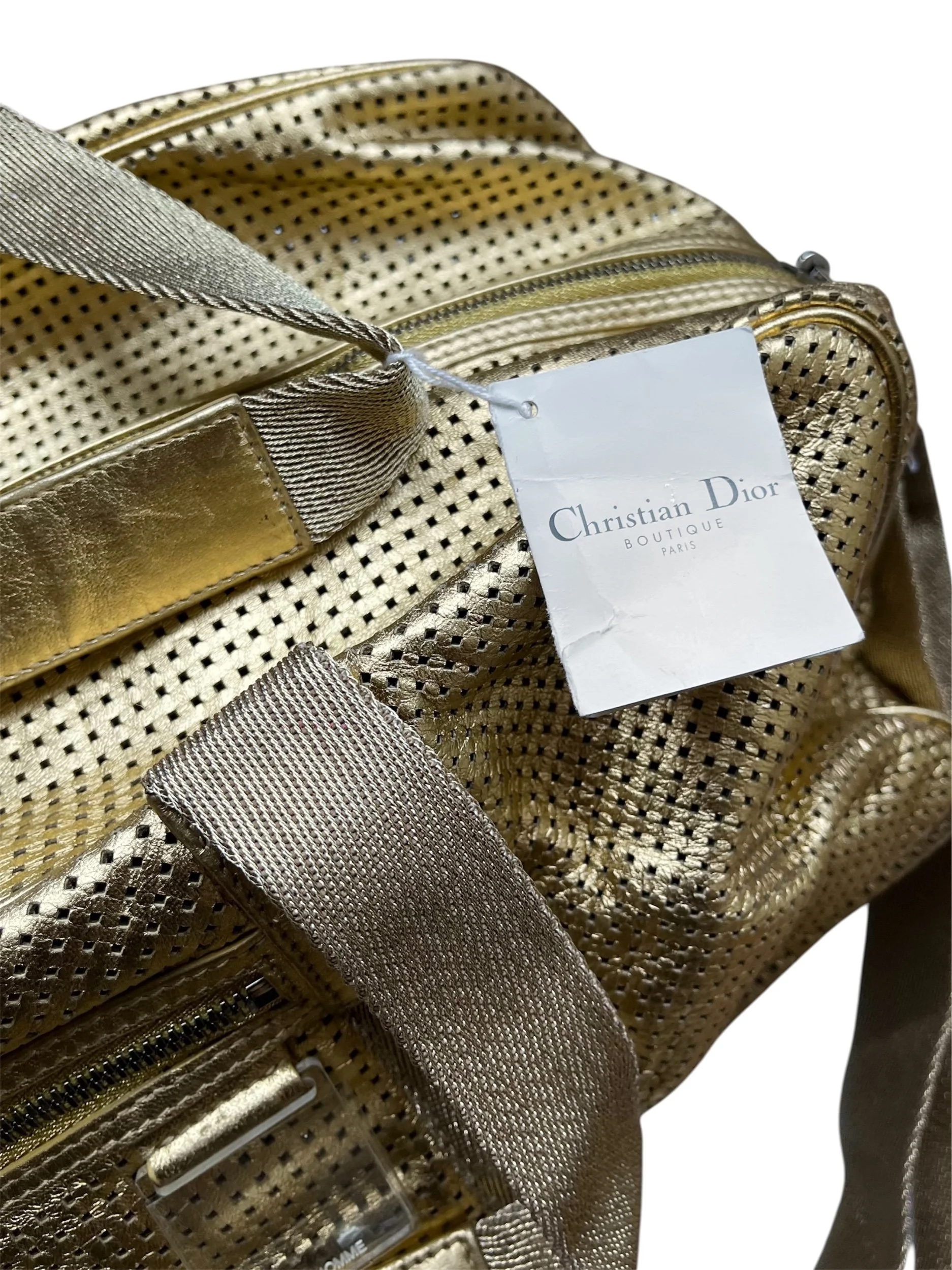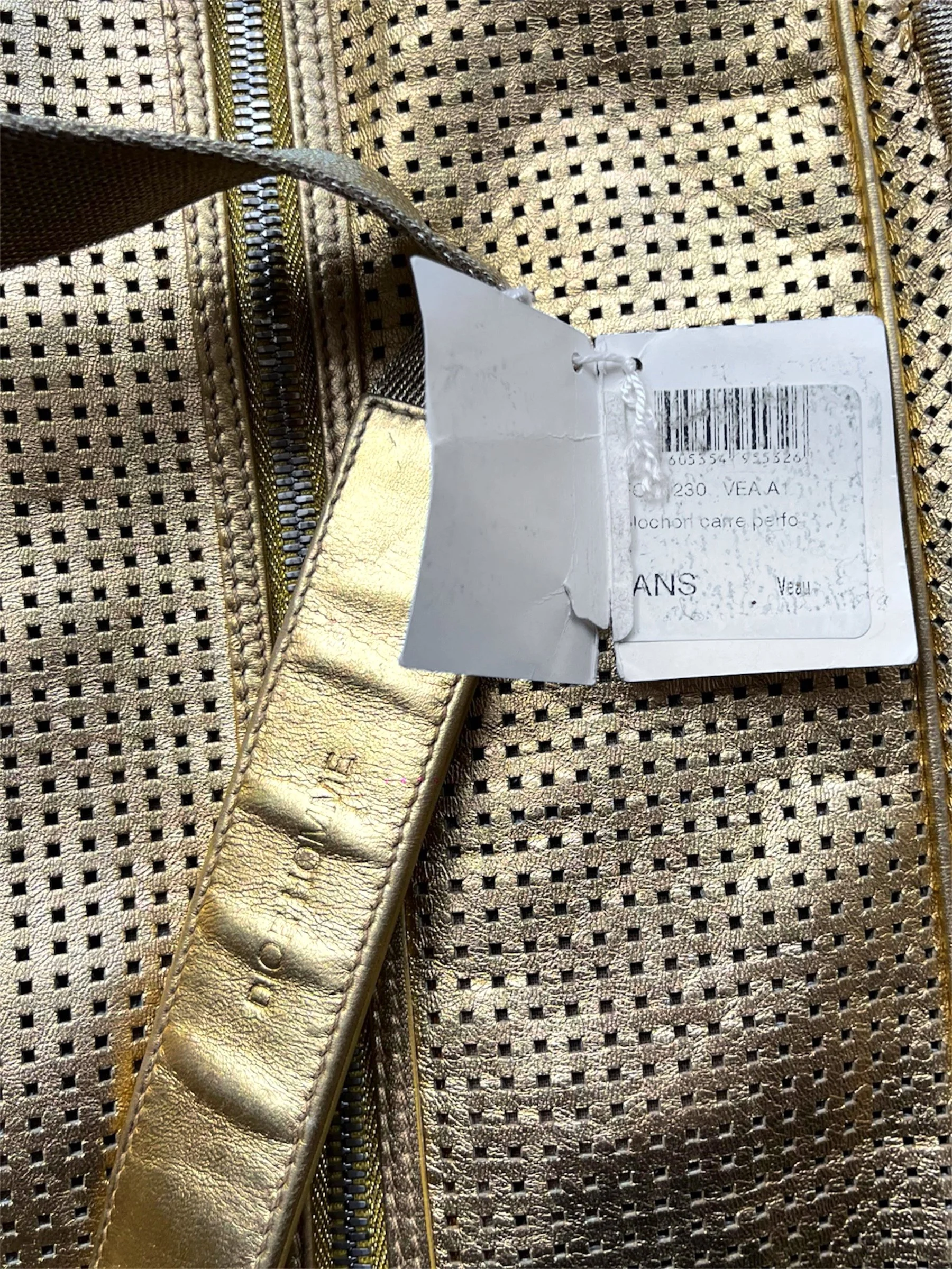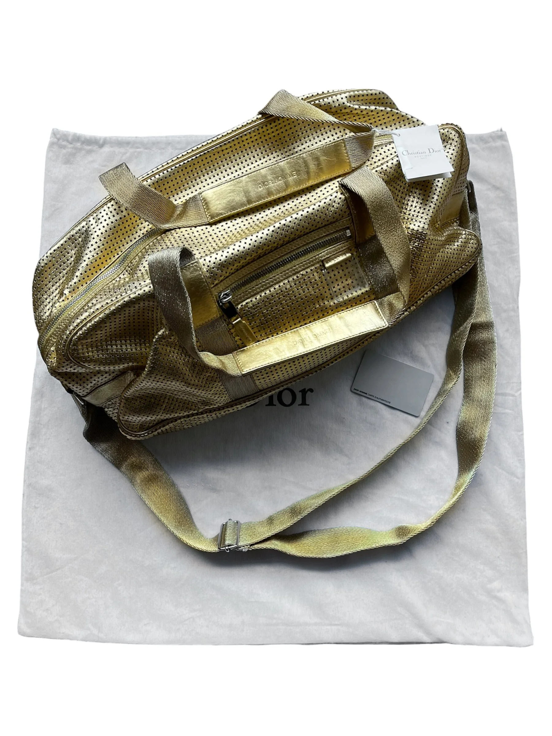 Rare gold duffle bag in perforated veal leather. Brand new with tags, dustbag and authenticity card. Featuring gold strap.
